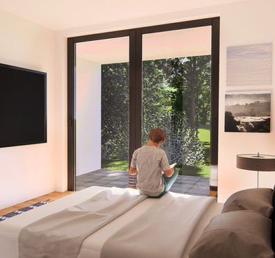 Si articola con una vasta zona giorno con affaccio su un patio chiuso e direttamente comunicante con il giardino o con la piscina (quest’ultima opzionale).